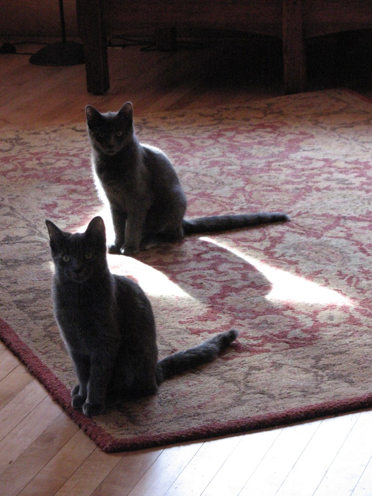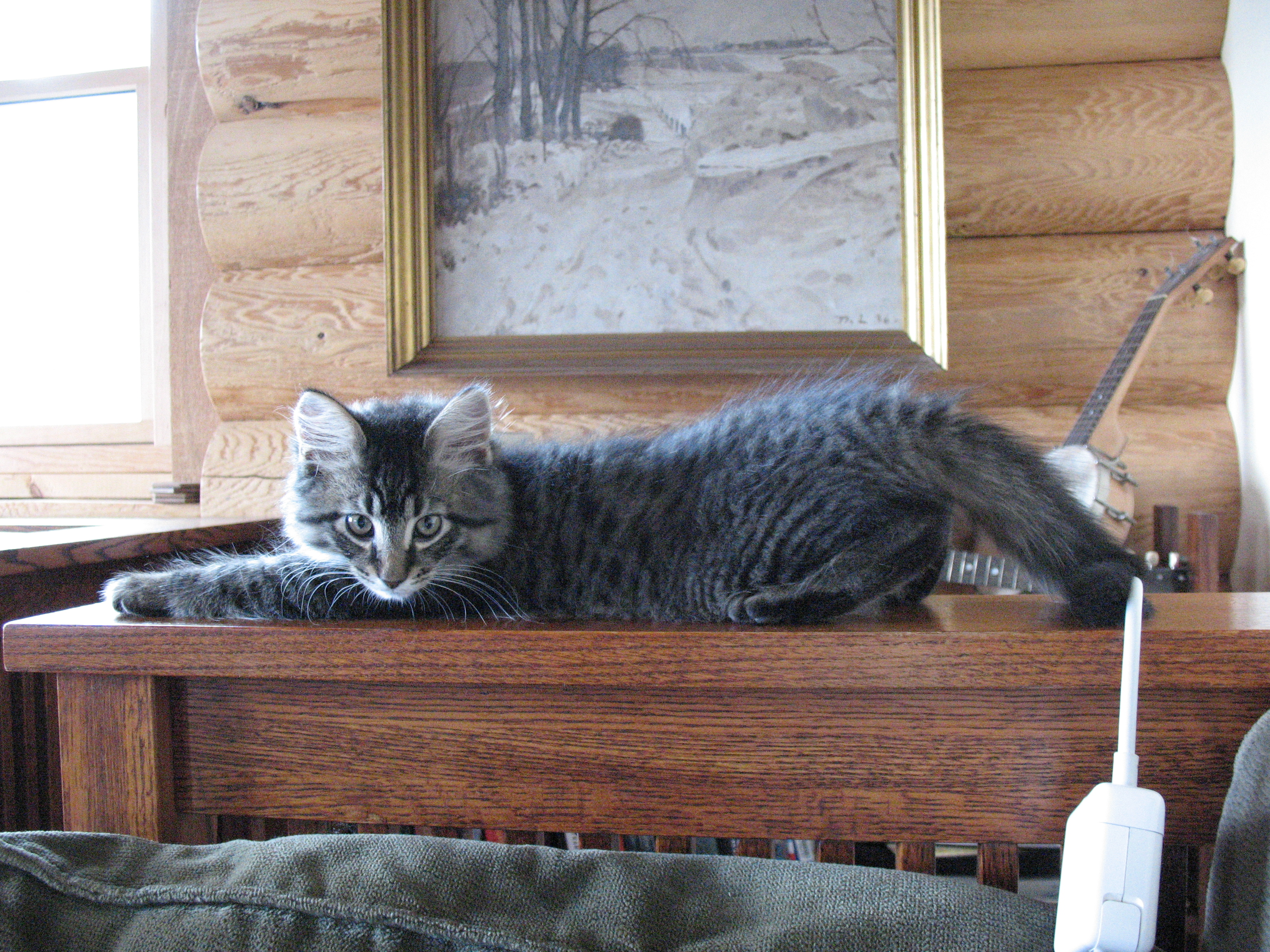 When they arrived, Maki was much smaller, the runt of the litter. They came infested with fleas and ear mites. We’re old hands at cat care, we started combing and treating the ears. We held off a month on their first vet visit, to get them cleaned up a bit, and stabilize them. At this stage they were strictly indoor kitties. I have a nine pound rule. Kittens do not go outside unsupervised until they’re bigger than the average appetizer. We draw the line at nine pounds.