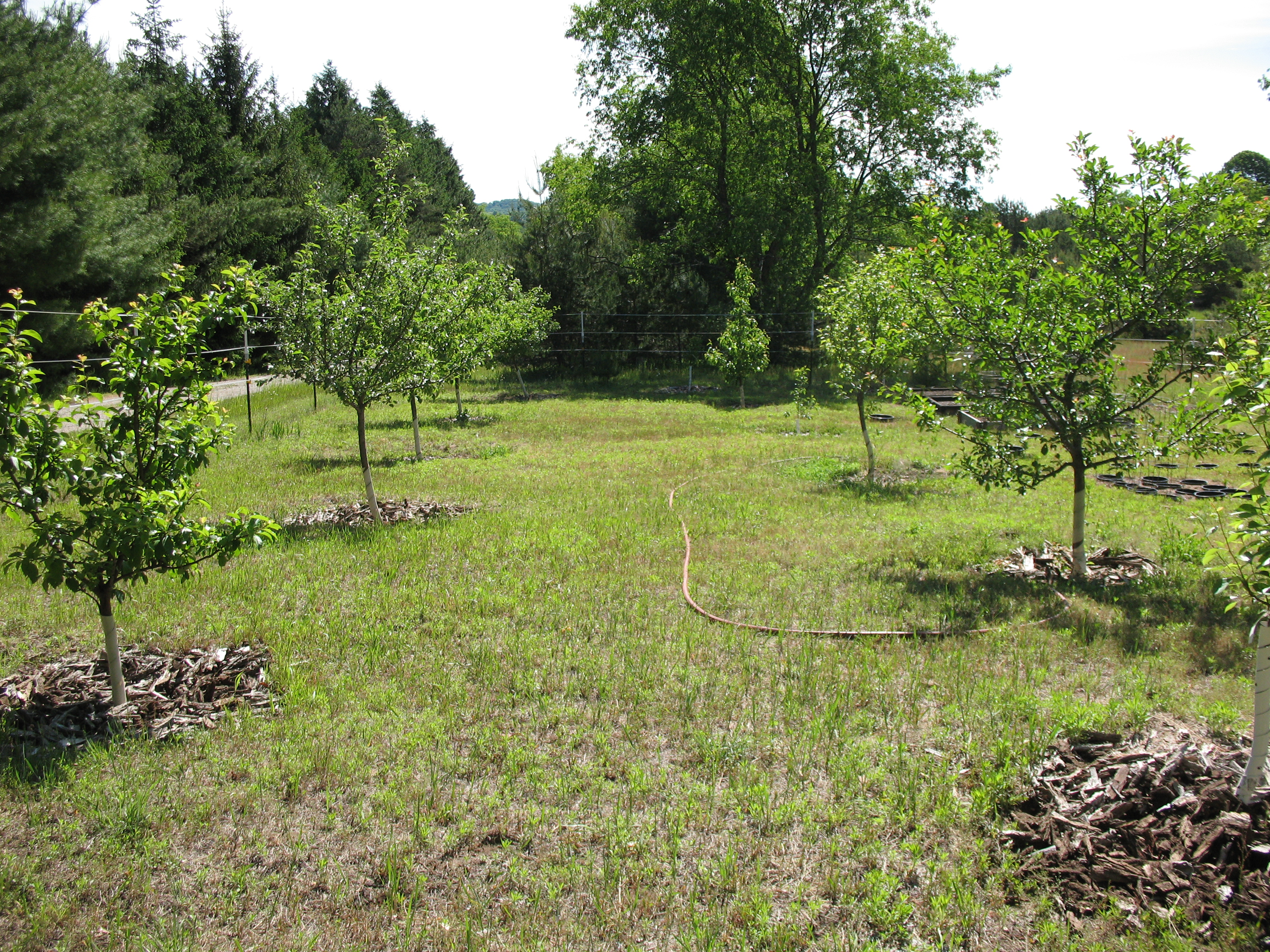 Twelve trees left to go. Ten will go into pots, for later placement in locations that are not yet finally graded. The last two I’ll plant tomorrow. It seems appropriate to finish up on May Day. Of the trees already planted, sixty-seven of them got the “full-spa” treatment, orchard quality planting. Though we’ve planted over 200 trees before–never with so many getting the fancy planting protocol We are tired. Maybe we are getting old. As the last trees went into the new West Orchard, we were already planning the next round…pollinating partners to the new trees and locations for next spring. We must be insane.