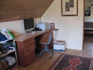 A desk for me, and a desk for him. Now, the room still doesn’t have trim, and I still have to sort, organize and file all those boxes of papers, but it’s a working office. A place to work and to write. All our crap is now cleared from the living room and dining room. Mostly, it gives me clear head space–and that gives me room to resume writing. Slowly and surely, we’re settling in, even after years…in fits and starts.