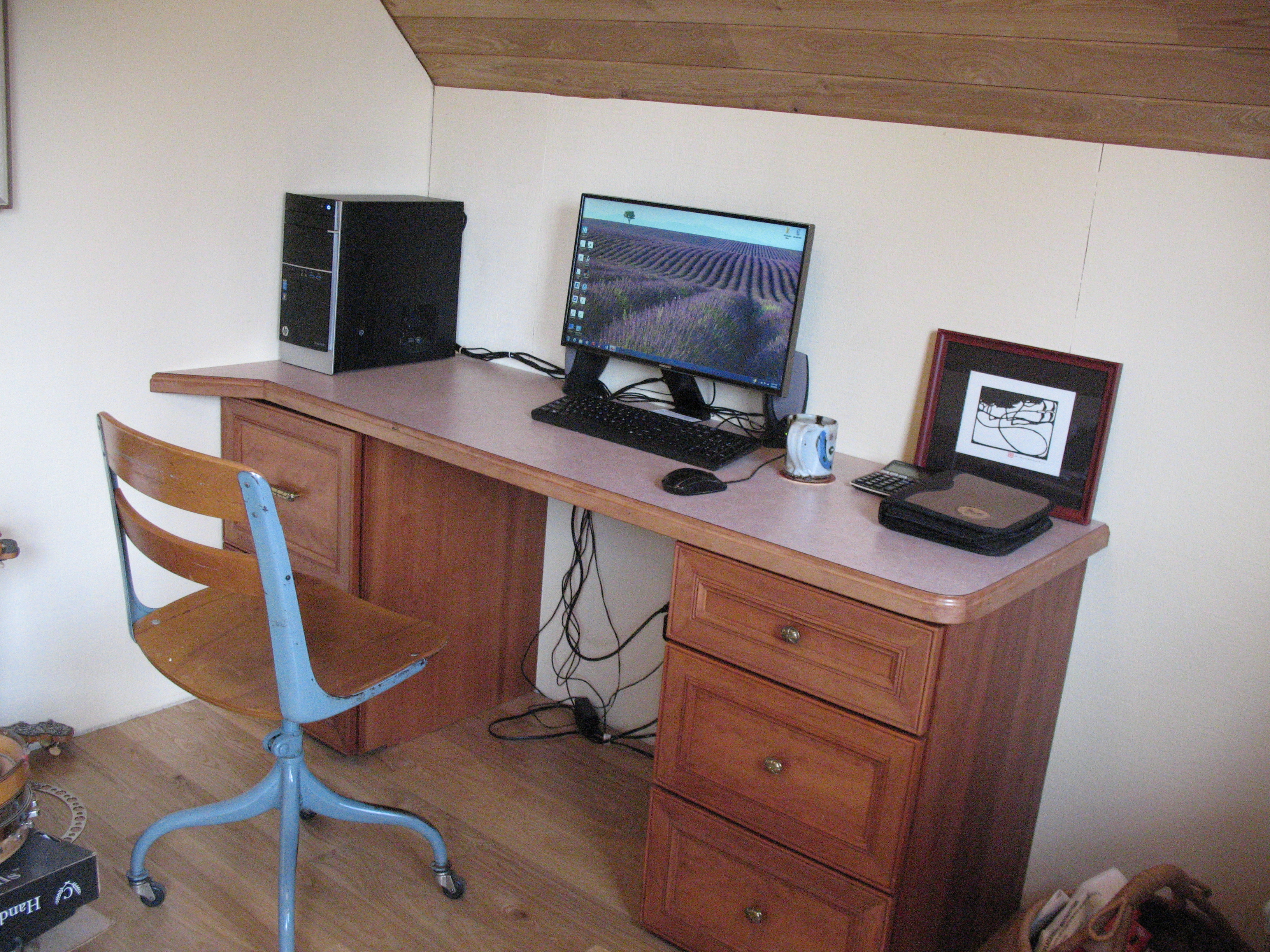 There’s nothing like a new solution to drive a project forward. This won’t be their final incarnation. We have some maple table-top thingies in storage that will ultimately finish them off, but for now the original desktops will do. I had to clear a bunch of assembled junk, and find proper homes for things to keep. Within a week, Rick had done all the necessary customizing (they were too tall)(he had to ‘fit’ the tops), and we were installed!