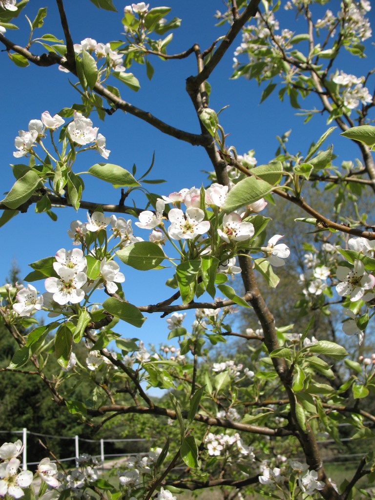 This year we had weird weather–a rolling month of warm days and freezing nights. It confuses the poor trees. They’re inclined to bloom (and some did), only to lose the blossoms to the freeze. This won’t be a heavy fruiting year. And, you need to watch that those freeze damaged blooms don’t become a pathway to disease–like fire blight. You have to be ready to prune off branch tips that wither or turn black. I’m especially keeping an eagle eye on the pear trees, as they can quickly succumb to neglected fire blight damage. It appears that freezing is no longer a risk. But warm weather, and its attendant bug-load has come on fast, nearly tripping over itself to invade the orchard.