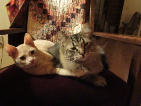 At just over two months I started checking the ads for rescue kittens. I resolved not to get hung up on looks—that all cats need homes and I’d take the first set of brothers I could find. And so we got Maki and Red. Maki looks shockingly like Milt. He’s a long-bodied, short legged, medium hair tabby—clearly some Maine Coon in him—tufted ears, neck ruff, thick racoon-like tail. His littermate, Red, is the complete opposite. He’s a long-legged, short necked, short-haired, ginger tabby, with a long, narrow striped tail.