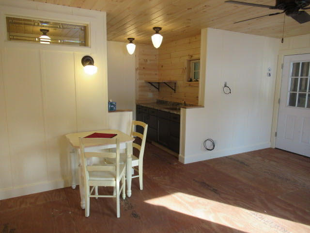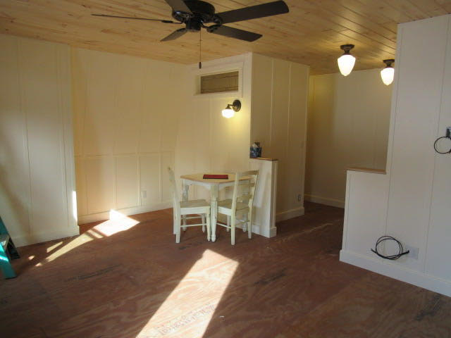 In keeping with our normal (some say excessively frugal) standards, everything we could buy second hand, or discounted, was worked into the budget. Even some of the lumber (the t&g ceiling material) was purchased from a local mill, off a Craiglist posting. To some extent we used up leftover materials and fixtures from building our house, and we scoured for deals on Craigslist and Marketplace. We found a carpet bolt end for less than 25 cents per square foot, vintage and overstock lighting fixtures on Ebay and Marketplace, a little direct vent heating stove and a water heater on craigslist. You name it, we scrounged it.