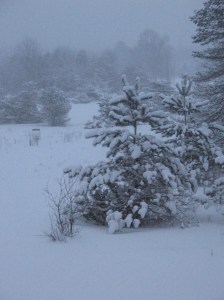 We won’t shovel or blow until tomorrow. No point. More will just keep falling. Our general rule is to avoid snow removal until ‘after.’ The one exception is if its a major blow, with more than a foot or so predicted. In that case, we’ll get out there half way through, to establish our various paths before the dump erases all of our visible margins. This is especially true for wet, heavy snow, because that makes the hand shoveled areas arduous. This, though, is lovely and light–clumping enough for a decorative frosting on the trees–without bending them over in submission. There’s plenty of time for snow removal. Today, we just enjoyed its beauty from our vantage point, warm and inside.