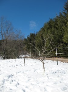 After last year, when we planted 36 orchard trees by hand, we bought an auger for the tractor. The auger is awesome. We’ve used it for concrete piers, for tree holes, and we’re having visions of new fencing. When the first batch of trees went in last month, we augured and planted 56 trees in a day. Not bad for two old farts.