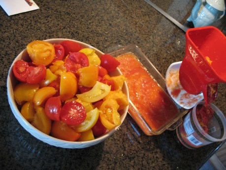 I know I said I was finished canning for the season. And then, there was the threat of frost, so we decided to do one last harvest before the more delicate items perished. We brought in peppers, the last eggplant, basil (but unfortunately, not enough of it), a bunch of late-maturing winter squash (spaghetti, moschata, butternut and one lone delicata that was hiding in the foliage) and then we took a hard look at the tomatoes. Sure enough, many had split and rotted after the rains. But looking closer, there were still a lot of really lovely tomatoes in there, so we harvested.