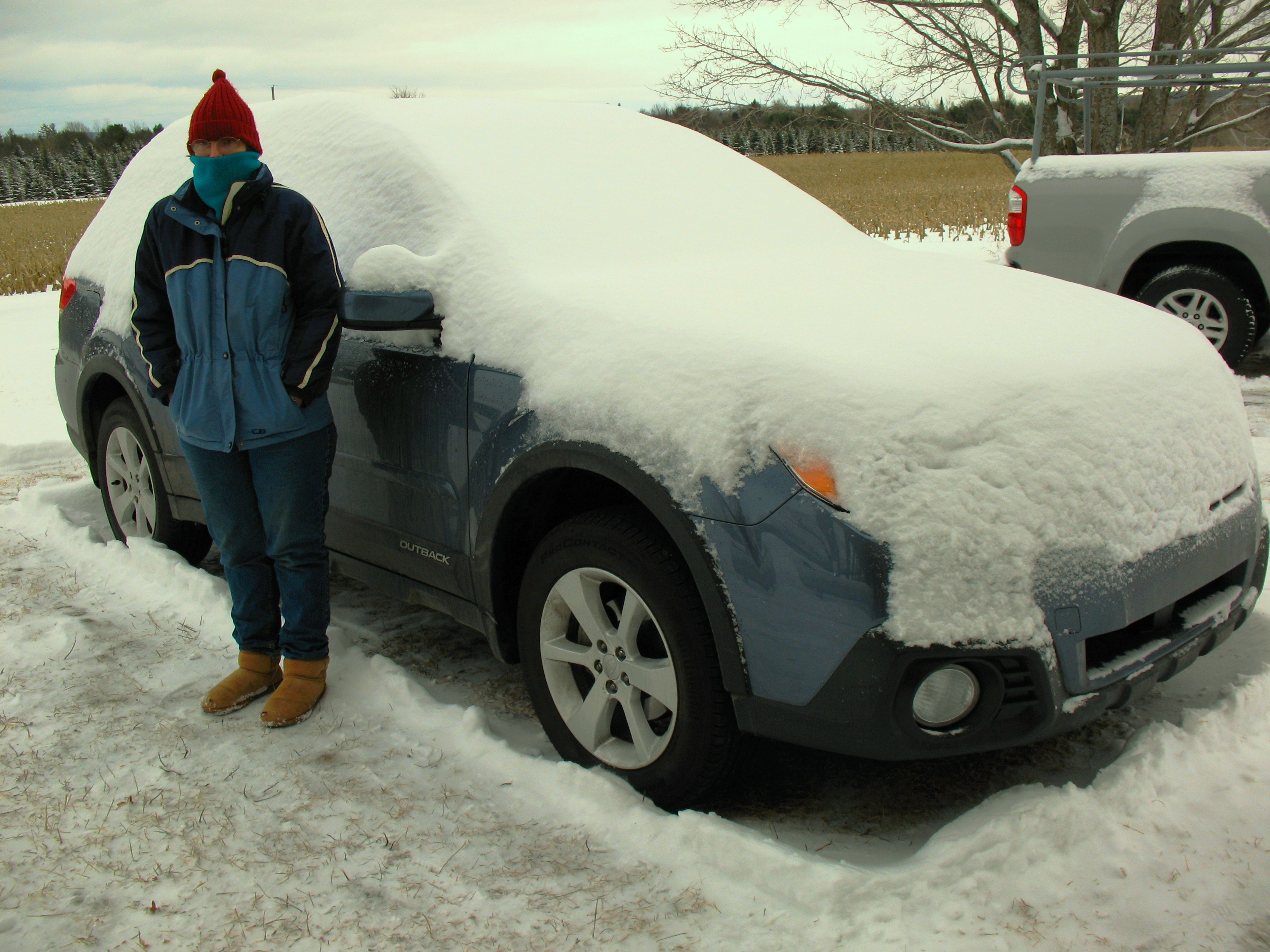 At this time of year, a car's color doesn't much matter. The coat? Blue. A hand-me-down from another sister. The jeans? A special on ebay. The high cost of blue.